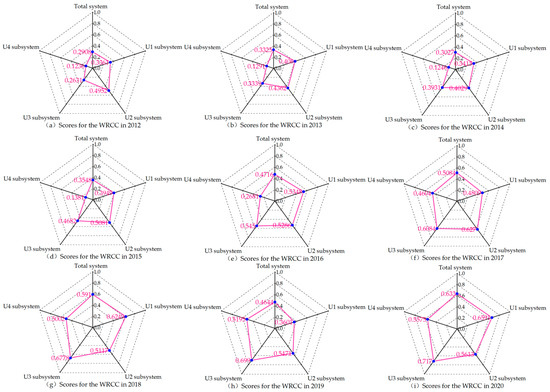 Taking the year 2020 as an example, the results illustrated that in 2020, the actual values of indexes U11, U14, U22, U31, U33, and U42 are closer to k1, and the membership degree μV1 is closer to 1, which is more favourable for the WRCC assessment in Xuzhou; In contrast, the actual values of indexes U12, U43, and U44 are close to k3, which has a more adverse impact on evaluation of the WRCC in Xuzhou.