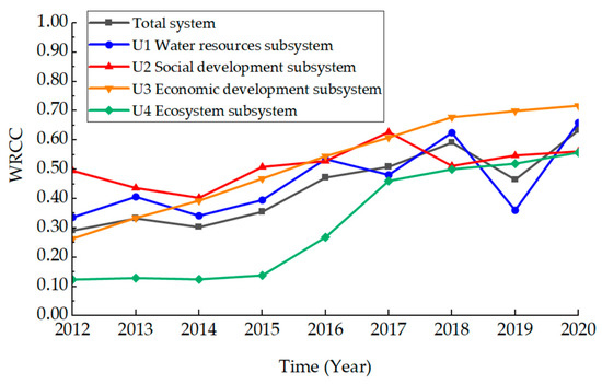 Following previous studies [58,59], these indexes were classified into three grades (V1, V2, V3) in this work, as shown in Table 1. V1 means a strong WRCC, i.e., a strong capacity for sustainable development, indicating that current water resources support socioeconomic development. V3 represents a weak WRCC, meaning that the ecological environment has deteriorated without adequate water resources to ensure socioeconomic development. Relatedly, V2 falls between V1 and V3, indicating that the WRCC of the region is moderate but still has considerable room for further development and utilization.