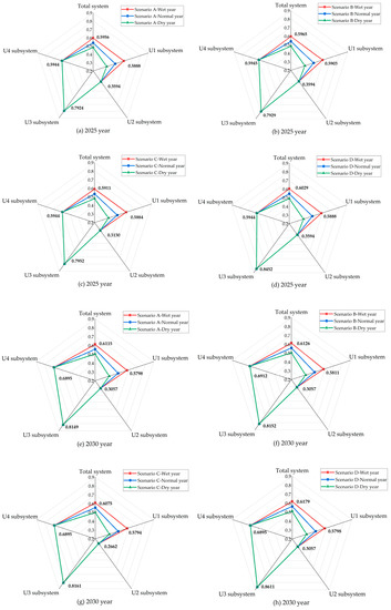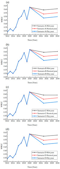 Due to the unpredictability of the future water resource situation, the water resources situation was divided into three conditions: wet years, normal years, and dry years based on the four scenarios. A summary of specific index values for the three water resource scenarios under the four development scenarios for 2025 and 2030 is shown in Tables S2 and S3.