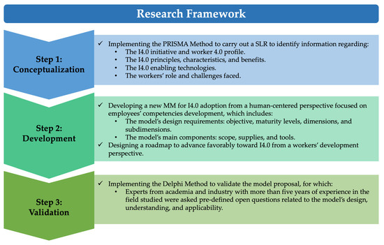The conceptual framework selected to develop the model for I4.0 adoption was based on the multi-methodological research approach for the development of maturity models, implemented by Wagire et al. [46] and Schumacher et al. [47], who based their established development guidelines on the work of Becker et al. [48], in which they followed the design science methodology presented by Hevner et al. [49]. The research framework used to develop a model for I4.0 adoption, based on the development of employees’ competencies and implemented in the present work, is summarized in Figure 1, which leads to a three-step methodology further detailed in Section 3.1, Conceptualization; Section 3.2, Development; and Section 3.3, Validation.