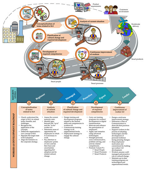 After developing the SLR, the most relevant skills were acknowledged and categorized into the worker competencies required for embracing I4.0. From this categorization and the identification of the main elements proposed in previous existing models for I4.0 adoption, the ECDMM4.0 was developed. However, when performing the literature review, a clear path for embracing I4.0 was not evident in the model review. Consequently, a roadmap to achieve “worker 4.0” development was determined, intending to encourage employees to develop new competencies, improve those currently mastered, and aligned with the digital strategy adopted in their organization.