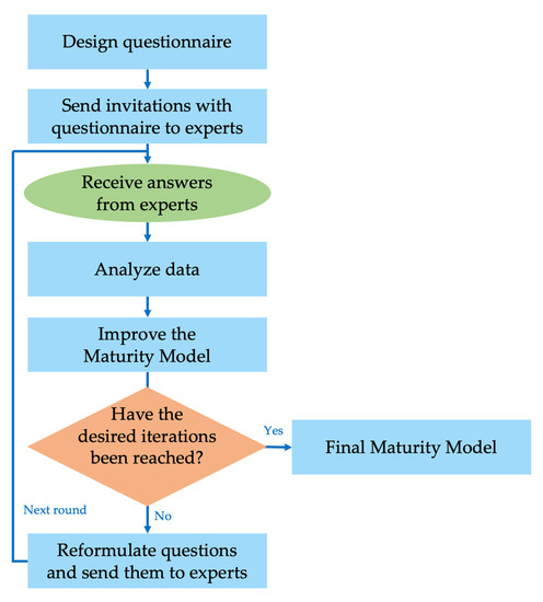 The subject in question for this study is the MM for I4.0 adoption, from a human development perspective. After some iterations with controlled opinion feedback, a consensus from all experts is reached, and a report can be documented [51]. It is worth mentioning that this research validation technique has been applied in several different areas, such as indicating the pros and cons associated with policies, exposing the priorities of social goals, and developing the structure of a model, among others [55]. The last area mentioned concerns the research being developed, as it is intended to generate an MM for I4.0 adoption, based on the development of workers’ competencies. In this sense, the validation of the MM is significant since the usefulness of a model must be validated so that its future applicability is not suspect [56].
