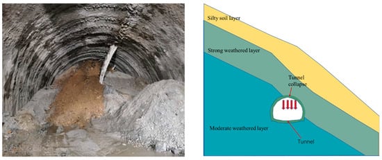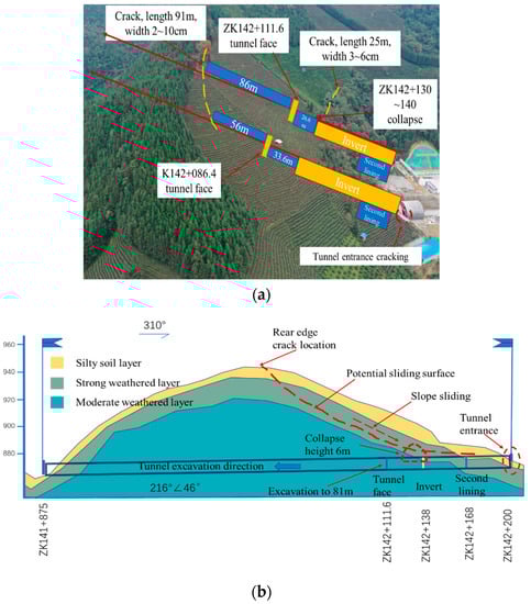 As one of the important structures in transportation, tunnels have the advantages of shortening the route mileage, improving alignment, saving space, and protecting vegetation, bringing huge social and economic benefits. Geological hazards, such as subsidence and landslides, are often triggered during the construction of highway tunnels in mountainous areas due to human-made excavation and natural disasters [1]. In terms of human causes, the effects of poor drainage systems [2], excessive explosive excavation blasting [3], anchor failure [4,5], and so on bring a great threat to the safety issue. In addition to the damage caused by human-made disturbances that destabilize tunnel slopes, tunnel construction is tested by the geological environment, climate, and natural disasters. The development of unstable rock masses [6,7], tunnel slope inclination [8], rainfall [9,10,11], earthquakes [12,13,14], and fires [15,16,17] all have adversely affected the safety of tunnel construction and normal operation. The effective control of the slope instability damage in tunnels and post-disaster treatment have been the focus of research in the field [18]. Sensors [19,20], optical fibers [21], and other monitoring and measuring methods are usually used to evaluate the deformation characteristics and stability of tunnel slopes, and protection techniques, such as prestressed concrete cylinder pipe [22], pipe jacking [23], and construction optimization [24,25], have been developed. However, the geological conditions of tunnel engineering are complex, and the applicability of protection techniques is not widespread. Therefore, it is necessary to clarify the force pattern and damage mechanism of tunnel landslides to propose reasonable prevention and treatment methods for specific projects. Clarifying the damage mechanism of tunnel slopes can provide a theoretical reference for the design of tunnel slope engineering and is the key to the design of related management engineering.