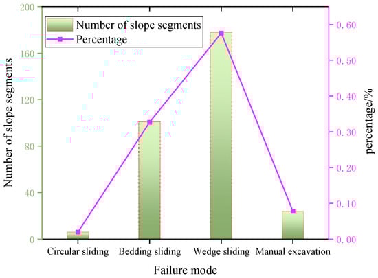 A total of 309 slope sections were investigated in a site exploration survey of highway slopes greater than 30 m in height in southwest China, and the damage patterns of the slopes were counted, as shown in Figure 2. The slope sections with circular sliding, parallelogram sliding, wedge sliding, and manual excavation damage accounted for approximately 2%, 33%, 57%, and 8% of the slope sections, respectively. Combined with the comprehensive analysis of the slope investigation where sliding and slumping have occurred on-site, the number of slopes where large-scale parallelogram sliding occurred on-site is relatively small, and more landslides are localized reverse-layer or cut-layer wedge sliding, although reverse-layer or cut-layer working conditions are conducive to slope stability, According to field research, most of the sections in southwest China are Tertiary sandstone slopes, and some of the rock masses are strongly disintegrated, with thicker strongly weathered layers, so wedge sliding occurs more often. The landslides investigated in this study are wedge slides, which are typical in southwest China.
