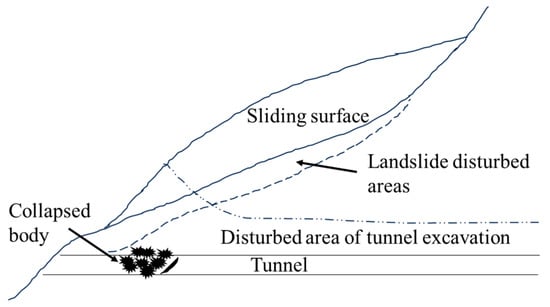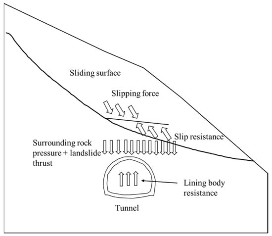 A large number of engineering examples show that the relative position of the tunnel and the landslide structural form will have a greater impact on the force deformation and damage mode; therefore, to determine the spatial location of the tunnel and landslide for the study of tunnel–slope interaction, a damage mechanism is essential. In this paper, the tunnel landslide system is a subway landslide tunnel, whose damage is dominated by the deformation of the arch, which is affected by the additional load of the landslide thrust to induce extrusive deformation and cracking. The misplaced platform, the crack width of the cavity section, is large with an extended length; the closer the cavity section deformation is, the more likely it is that a more serious collapse and roofing and other accidents may occur [37,38]. The spatial location of the tunnel through the landslide is shown in Figure 3, and the force pattern is shown in Figure 4. Based on the strength reduction method, the slope safety factor Fs is used as an indicator to evaluate the stability of the slope, and its physical meaning is the ratio of the slip resistance of the soil to the sliding force, where Fs < 1 means that the slope has been destabilized and damaged [39]. The maximum disturbance radius Rpmax of the tunnel excavation, the maximum additional load max on the lining corresponding to the thickness H0, and the minimum safe undercutting distance Hmin of the tunnel can be calculated according to the following equations [40,41]: