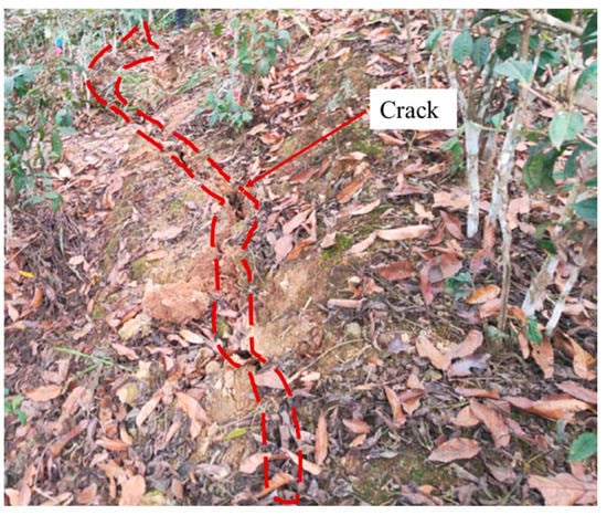 On 20 December 2020, a crack of approximately 25 m in length and 3–6 cm in width appeared on the left side of the mountain at a location of approximately 45–70 m. The crack was presumed to be caused by the collapse of the left tunnel, as shown in Figure 6.