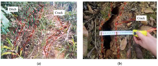Deformation and crack diagram of the slope at the rear edge of the tunnel. (a) Slope of the rear edge and (b) the maximum deformation crack.