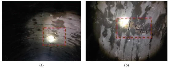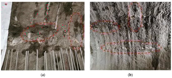 Cracking diagram of the lining of the right hole of the tunnel: (a) Peeling phenomenon of the primary support at the left vault of the right hole K142 + 115; (b) peeling of the initial branch at the left arch waist of the right hole K142 + 115.