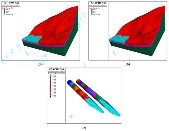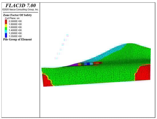 This study simulated the treatment of tunnel slopes in FLAC3D to guide the actual reinforcement and treatment on site. The simulated solution to meet the slope stability control requirements consisted of slurry reinforcement, interception and drainage, surface grassing, toe counter-pressure, and anti-slip piles for areas where plastic zones may occur. The treated tunnel slope should meet the requirements of the Technical Specification for Construction Slope Engineering [42], which requires a permanent slope safety factor of more than 1.25.