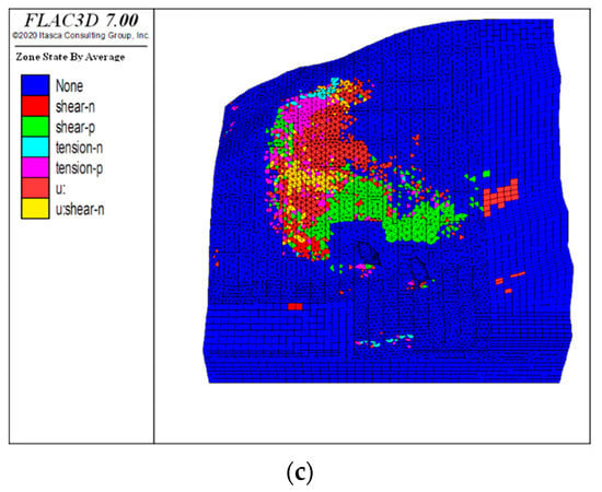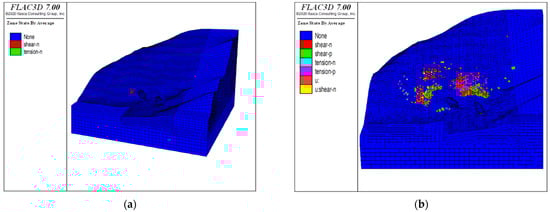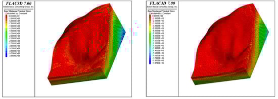 To simplify the simulation process by ignoring the construction of the open tunnel and its impact on the slope, the entrance tunnel envelope was simulated with a simplified reinforcement treatment by increasing the cohesion value of the reinforcement area to 1 GPa, increasing the uniaxial tensile strength value of the reinforcement area to 0.1 GPa, leaving the friction angle unchanged, and using an increased strength parameter to remove the joints that existed throughout the reinforcement area. The tunnel excavation process was divided into three construction simulations: the first section of tunnel construction was based on an approximate simulation of the completion of the left and right tunnel sections up to 50 m; the second section of tunnel construction was based on the excavation of the left and right tunnels up to 60 m, with the right tunnel excavated and supported in time and the left tunnel not supported in time, causing the tunnel to collapse; and the third section of tunnel construction was based on the excavation of the left and right tunnels up to 88.4 m. The maximum stresses in the profile at key locations after excavation and construction of the three tunnel sections are shown in Table 2, Table 3 and Table 4, the plastic damage zone is shown in Figure 13, and the slope safety factor distribution is shown in Figure 14.