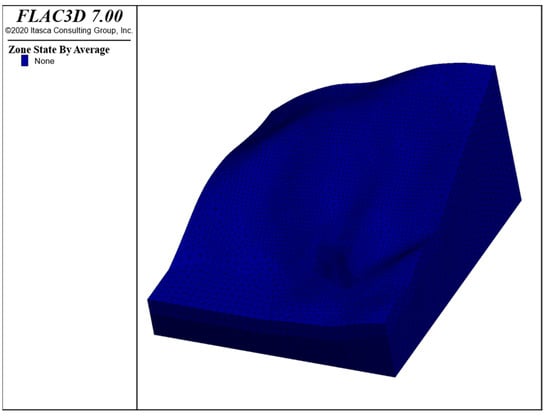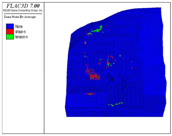 To investigate the effect of tunnel excavation on the stability of the slope, a static stability analysis of the slope in its natural state was carried out, and the stress region of the slope before tunnel excavation was calculated as shown in Figure 11, with the plastic damage zone as shown in Figure 12.