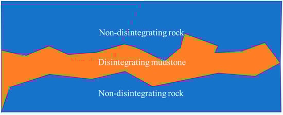 According to the simulation calculation results and the results of the geological survey report to analyze the damage mechanism of the tunnel–slope interaction down through the landslide tunnel, we encountered weak surrounding rock, adverse geological bodies, tunnel import, and shallow export burial depth. After the excavation disturbance, a range of large elevation slope deformation damage was seen in the hole after the rock body was broken (left line tunnel cracks), and not having timely support after the blasting excavation resulted in a potential sliding surface creep–slip action on the tunnel lining structure body. This resulted in tunnel convergence, sinking of the arch footings, and cracking of the lining. The presence of disintegrating mudstone caused the rock and soil on the slope to be less strong and more susceptible to deformation and damage; on the other hand, some of the disintegrating mudstone and hard rock, in the form of interlayer, was affected by weathering camp forces after excavation. The disintegrated mudstone and non-disintegrated rock produced differential weathering and formed a soft interlayer, as shown in Figure 17, which easily led to wedge-shaped sliding damage of the elevation slope and was not conducive to the stability of the debris rock elevation slope.