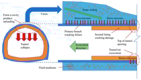 The interaction between tunnel damage and slope instability was magnified by the rheological nature of the mudstone contained in the tunnel envelope. When the tunnel was excavated to 50 m, the left tunnel collapsed, and a cavity was formed at the top of the collapsed cavity, resulting in some unloading, which led to the potential sliding surface of the elevation slope sliding down. The sliding stresses generated by the slope sliding down were applied back to the tunnel, further increasing the stresses in the lining structure and at the top of the cavity slope. The excavation at the foot of the cavern caused a relaxation of the lower structural stresses, which eventually led to the cracking of the lining structure and the cavern opening, with the cracking damage pattern as shown in Figure 18.