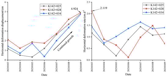 To grasp accurately the tunnel slope cracking deformation situation and predict the future deformation trend, tracking measurements were carried out at the location of the tunnel slope cracks. Sections K142 + 025, K142 + 028, and K142 + 034 were selected for horizontal and settlement deformation and displacement monitoring, and the relevant displacement–time and rate–time curves were obtained, as shown in Figure 19 and Figure 20.