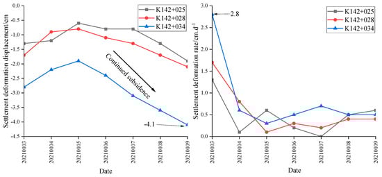 The settlement deformation displacement of each section monitoring point showed a continuous sinking trend, the maximum settlement displacement value was −4.1 cm, and the sinking displacement value was large, indicating that the stability of this section of the slope was poor. The settlement deformation rate was greater than 0 cm.d−1, the maximum deformation rate was 2.8 cm.d−1, and the overall fluctuation in the upper and lower sections was 0.5 cm.d−1, which indicated that the amount of slope settlement would continue to increase.
