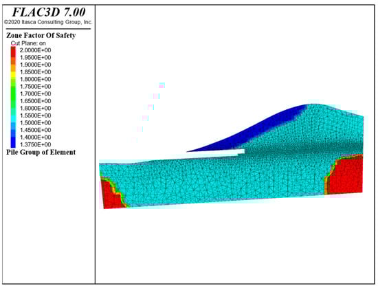 For comparative analysis, numerical simulations were carried out for the construction of the tunnel without considering the presence of a left line tunnel collapse. The maximum stresses in the profile at key locations are shown in Table 5, the distribution of the plastic damage zone is shown in Figure 15, and the distribution of the side slope safety factor is shown in Figure 16.