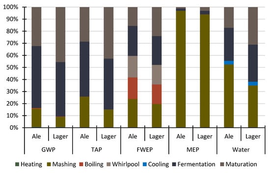 Table 5 presents the LCI of the brewing process for ale and lager at the microbrewery and pilot scales. The ale brewed by the microbrewery used 6 kg more malt than the lager for production of one barrel because of the higher final extract concentration (specific gravity = 1.0539) required. Consequently, the ale used approximately 27% more natural gas for boiling. The fermentation and maturation stages were the hotspots of electricity use in the microbrewery, respectively accounting for approximately 61.3% and 38.6% for the ale and 49.7% and 50.2% for the lager of their total electricity uses. Due to the differences between the physiological requirements of ale and lager yeast strains, the lower temperatures and prolonged periods required for lager fermentation and maturation resulted in its 24% higher total electricity use compared to the ale. Similarly, De Marco et al. [13] reported that lager beer consumed 36% more electricity than ale. The sugar assimilation efficiency of a yeast strain during fermentation is determined by the expression of its specific genes that transport α-glucosides (e.g., maltose and maltrotriose) across the yeast cell plasma, which can be delimited by the temperature of the environment [22,23]. For instance, lager yeast strains have been reported to show a five-fold reaction rate at 0 °C compared to those at 20 °C [24]. However, a lower fermentation temperature consumes more energy. Therefore, from the cost perspective, it is necessary to determine the optimal combination of fermentation temperature and time for the specific yeast strain used in order to minimize the energy use for fermentation.