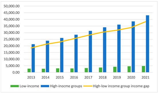 The issue of income inequality is an economic issue of general concern to all countries, not only as a matter of “equity” but also as a matter of “efficiency”. Excessive income inequality not only results in an uneven distribution of social resources, hindering the pursuit of shared prosperity, but also leads to a growing wealth divide. This wealth divide can reduce individual motivation and work incentives, thereby impacting economic growth and overall efficiency. Income disparity encompasses not only the gap between urban and rural areas but also inequality within these regions among residents. China has implemented the ‘rural revitalization strategy’ in recent years, leading to a notable increase in rural residents’ incomes. However, concurrently, the income gap among rural residents in China has been expanding continuously (refer to Figure 1) [1]. In 2021, in the quintile grouping of rural residents’ per capita disposable income, the income gap between the 20% of rural households with the highest income and the 20% of rural households with the lowest income reached 8.87 times, with a significant intra-rural income gap. Comparing the intra-income gap between urban and rural residents, income inequality is even more pronounced in rural areas, with the intra-rural income gap consistently higher than in urban areas [2]. An excessive income gap among rural residents not only undermines social stability but also hinders the sustainable development of the rural economy. Conversely, a moderate income gap can foster economic growth and reduce overall income inequality [3].