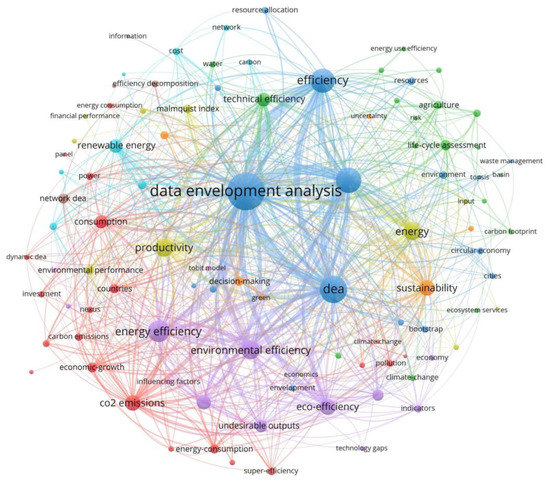 Rapid economic and social development has brought about the continuous expansion of energy demand. The contradiction between energy supply and demand in countries around the world, especially in developing countries, has become increasingly prominent. Efficient energy utilization models have gradually become a research hotspot. Many scholars have carried out in-depth exploration in the field of energy utilization and gradually formed a relatively complete method and application system. Life cycle assessment (LCA) [8], stochastic frontier analysis (SFA) [9], and data envelopment analysis (DEA) [10] are all effective methods for quantitative studies of energy utilization efficiency (EUE). Among them, the data envelopment analysis model, as a non-parametric model, is widely used in the field of resource and energy efficiency measurement and has produced rich research results. Relevant studies cover different research scales, such as countries [11,12,13], river basins [14,15], provinces [16,17], and cities [18,19]. For example, Zhang et al. used a three-stage SBM model to evaluate the energy utilization efficiency of RECP countries and its influencing factors [12]; Pan et al. quantitatively calculated the energy utilization efficiency of 30 provincial-level administrative regions in China based on the SBM-DEA model and explored its driving factors using a regression model [20]. In terms of research objects, relevant research covers traditional fossil energy [21]; mature green energy, such as water energy, wind energy, and photovoltaic energy [22,23]; and emerging renewable energy, such as biomass energy and geothermal energy [24]. For instance, Chen et al. combined the DEA model to explore the utilization efficiency of different types of fossil energy in 30 provincial-level administrative regions in China [25]; Meng and Du conducted a quantitative study of green energy efficiency in different provinces of China using the DEA model [26]. Based on the core database of the Web of Science, this study sorted a total of 1000 DEA topic-related studies in the past five years and used the LinLog layout algorithm and the modularity clustering algorithm to construct a high-frequency keyword contribution network (Figure 1) which can reflect key information, such as research objects, fields, research scales, and model methods, related to this topic to a certain extent. A comparison of selected studies related to energy efficiency based on data envelopment analysis is shown in Table 1.