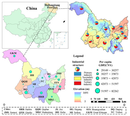 Exploring the coordination relationship between energy utilization and industrial structure with traditional energy provinces as the research area can better verify the applicability of the measurement–quantification–identification three-stage analysis method and increase the reference value of research findings for regional development. Heilongjiang Province is an important energy and industrial province in Northern China and plays an important role in China’s energy security [6]. Nonetheless, conspicuous discrepancies in economic progress emerge among the diverse cities nestled within Heilongjiang Province. The divergence is conspicuous when considering per capita GDP. The per capita income of DQ, HRB, and HH is relatively high, while the per capita GDP of QQH, QTH, and SH is at the lower level for the whole province. In terms of industrial structure, Heilongjiang Province is primarily based on the first and third industries, but certain industry-dominated cities, such as DQ and QTH, still have a significant proportion of the second industry. Over the past 70 years, Heilongjiang Province has produced more than 4% of China’s raw coal, 6.2% of its natural gas, and 32.9% of its crude oil, providing vital energy security for China’s economic and social development and ecological civilization construction. Against the backdrop of the “Revitalization of Northeast China” strategy, promoting the optimization and upgrading of the industrial structure, as well as improving energy utilization efficiency, have become pressing bottlenecks that different cities in Heilongjiang Province must overcome to achieve high-quality development. An overview of the study area is presented in Figure 3.