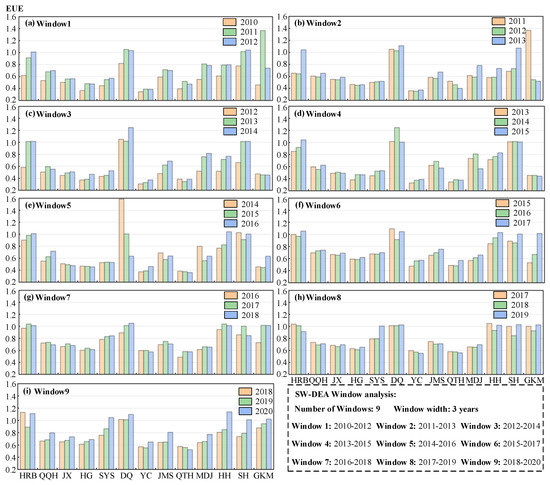 The energy utilization efficiency (EUE) for all nine windows can be found in Figure 4. During the study period, DQ consistently reached the production frontier in almost all windows. As the core industrial city of Heilongjiang Province, it exhibited a significant advantage in terms of energy utilization compared to other cities. Most cities showed a year-on-year increase in energy utilization efficiency within the same window, while the efficiency values for the same year decreased as the window shifted. Taking HRB as an example, the efficiency value in 2012 is 1.01 in Window 1 but decreases to only 0.58 in Window 3. This indicates that the energy utilization levels of certain cities are rapidly improving, pushing the production frontier forward. It also confirms the relative nature of the results obtained through the SW-DEA model.