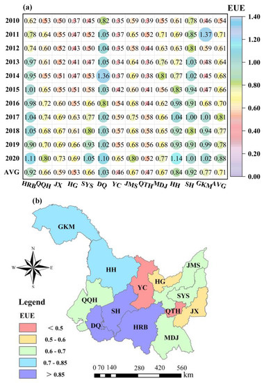 After further processing the EUE for specific years across all windows, the final results for energy utilization efficiency for the 13 cities in Heilongjiang Province from 2010 to 2020 are depicted in Figure 5a. Overall, there has been a significant improvement in energy utilization levels in Heilongjiang Province over the course of 11 years. The average EUE has increased from 0.54 in 2010 to 0.88 in 2020. Notably, the EUE values for the years 2017, 2018, 2019, and 2020 are significantly higher than the multi-year average of 0.71. On one hand, technological progress serves as an endogenous driving force for the improvement of EUE [18,20]. However, these results also reflect to some extent the efforts and determination of China to promote the energy revolution and transform energy utilization patterns in recent years [54]. Another interesting finding is that, in 2010, none of the cities were able to reach the production frontier in terms of energy utilization efficiency (EUE ≥ 1). However, by 2020, the number of effective DMUs had increased to six. Cities like DQ and HRB have achieved leading levels of energy utilization efficiency within the province, continuously pushing the production frontier forward. This finding further illustrates that cities with a strong industrial foundation and robust economic strength play a crucial role in driving the overall improvement of energy utilization levels in their respective provinces or regions. A related study has also reached a similar conclusion [18].