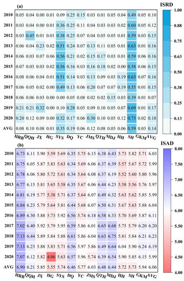 The results of ISRD and ISAD for the 13 cities in Heilongjiang Province from 2010 to 2020 are depicted in Figure 6. From Figure 6a, it is evident that the average ISRD at the urban level is 0.14. Only three years (2010, 2011, and 2018) exhibited ISRD values lower than the average. Among the 13 cities, HRB, JX, HG, YC, QTH, MDJ, HH, and GKM demonstrated a higher level of industrial structure rationalization, with their multi-year average ISRD values below 0.1. However, the cities of SH and SYS displayed ISRD values of 0.59 and 0.35, respectively, indicating a relatively higher degree of industrial structure irrationality. During the research period, there was an increasing trend in the overall ISRD of Heilongjiang Province, indicating a gradual deviation from a balanced state and a certain degree of irrationality in the industrial structure. This can be attributed to the significant outflow of the province’s employed population, particularly high-quality talent, in recent years. Additionally, the aging trend has become more pronounced in the region. Feng’s study has shown that several cities in Heilongjiang have reached varying degrees of aging status [55]. The disproportionate decline in the employed population is the primary cause of the overall increase in ISRD in Heilongjiang Province.