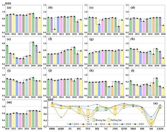Industrial structure development levels. (a–m) represent HRB, QQH, JX, HG, SYS, DQ, YC, JMS, QTH, MDJ, HH, SH, and GKM, respectively; (n) shows the comparison of ISDI changes in all cities.