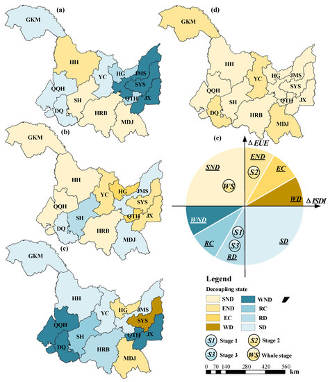 Between 2011 and 2013 (Figure 8a), the cities of QQH, DQ, YC, and GKM exhibited a strong decoupling relationship between EUE and ISDI. This means that while their industrial structure development level continued to improve, their energy utilization level decreased, indicating weak dynamic coordination between the two. Conversely, HRB, MDJ, and SH were in a strong negative decoupling state, where their energy utilization level increased while ISDI showed a declining trend. Due to the simultaneous decrease in both EUE and ISDI, with the former declining more significantly, HG and QTH exhibited a deteriorating decoupling relationship during this phase. In contrast, the cities of JX and JMS experienced a simultaneous decrease in energy utilization efficiency and industrial structure development index during this phase, but the decline in ISDI was significantly greater than that in EUE, indicating a weak negative decoupling relationship between the two. Heihe City exemplified a positive growth synergy between EUE and ISDI, with the former growing at a faster pace than the latter, indicating an expansive negative decoupling state. In pursuit of carbon neutrality goals, China has recognized the significance of enhancing energy utilization efficiency and curbing carbon emissions from energy consumption [42]. In this regard, an expansive negative decoupling relationship, as observed in Heihe City, represents an ideal coordination, where energy utilization efficiency increases while carbon emissions decrease. During the period of 2014–2016 (Figure 8b), JX, SYS, and YC transitioned into an expansive negative decoupling state, while JMS and MDJ shifted to a strong decoupling state. QQH, HH, and GKM changed to a strong negative decoupling state, and HG and QTH transitioned from a previous declining decoupling state to an expansive coupling state. Throughout this period, there was an overall improvement in the coordination between energy utilization efficiency and industrial structure development in Heilongjiang Province. From 2017 to 2019 (Figure 8c), QQH, JX, DQ, and QTH transitioned to a weak negative decoupling state, indicating a lack of coordinated development between EUE and ISDI throughout the study period. HG and MDJ shifted to an expansive negative decoupling state, showing a significant improvement in the coordination between EUE and ISDI compared to the previous stage. However, it is undeniable that, compared to the previous period, there was a certain degree of deterioration in the coordination between industrial structure and energy utilization efficiency in most cities during S3.