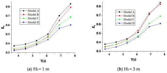 During the calculation, the space distance between the two boxes is 8 m and the opening width of OWC is 3 m with a water depth 25 m under three kinds of significant wave heights (1 m, 3 m and 5 m). The transmission coefficients of the four models are shown in Figure 14. The transverse coordinate represents the periodic T, and the longitudinal coordinate represents the transmission coefficient Kt. By comparing the transmission coefficients of the four structures, it can be observed that Model A exhibits relatively large transmission coefficients. Model D demonstrates relatively small transmission coefficients, approximately 27% lower than that of the double box structure. This suggests a significant wave dissipation effect. The transmission coefficients of Model C and Model B fall between these two. Therefore, considering the wave dissipation performance, Model D exhibits better wave dissipation characteristics. Additionally, the OWC float box on the upstream side possesses the potential to generate electricity from wave energy. Consequently, Model D represents a floating break-water with promising practical applications.