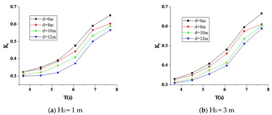 In this paper, three seawater depths are selected for simulation calculation, which are 18 m, 25 m and 36 m, respectively. The results, as shown in Figure 16, demonstrate that the transmission coefficient increases with an increase in water depth. Notably, the influence of water depth is more significant for short-period waves compared to long-period waves. Overall, as the water depth increases, the transmission coefficient gradually increases. This can be attributed to a decrease in water depth, equivalent to increasing the draft of the floating breakwater, which leads to a larger water-retaining area and greater wave-blocking capability, resulting in a decrease in the transmission coefficient.
