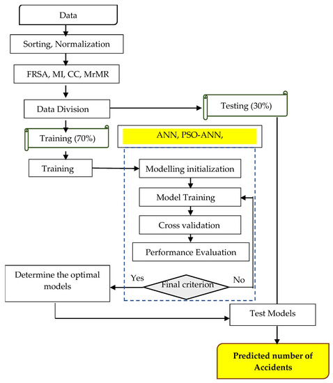 The proposed methodology involves two main stages; the first stage involves the selection of the most dominant input parameters through feature removal sensitivity analysis (FRSA), the maximum relevance minimum redundancy method, and the correlation coefficient values. The ANN and the hybrid ANN-PSO models were developed in the second stage using the dominant parameters. The schematic diagram of the methodology is shown in Figure 1.