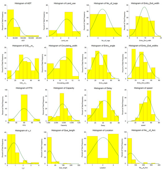 For a clear understanding of the data utilized for the study, a histogram distribution was plotted for all 15 parameters (Figure 3). It can clearly be seen that some of the parameters do not have a normal distribution (Number of accidents, ADT, CID etc.), while a few of the parameters are normally distributed (que length and capacity). The data are good for machine learning parameters as some of the parameters have a linear relationship with the target and some have a nonlinear relationship with the data. This makes the data suitable for the application of machine learning techniques. Shapiro-Wilk and Kolmogorov-Smirnov tests were further used to check the data normality. Normality was rejected in both tests at a 5% alpha value for all the parameters.