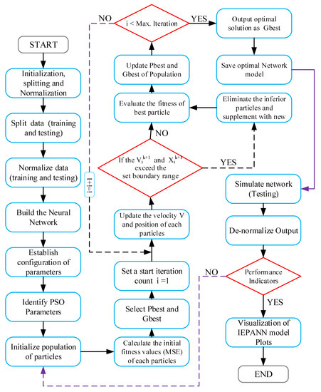 Flowchart for the ANN-PSO training algorithm.