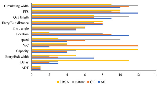 Relevant input selection is essential in obtaining reliable and accurate results in artificial intelligence-based models. For capturing both the linear and non-linear relevance of the potential parameters, four input section techniques—namely feature removal sensitivity analysis (FRSA), mutual information (MI), correlation coefficient (CC), and minimum redundancy maximum relevance—were used in the study. The result obtained in each of the techniques was used to rank the importance of each of the 11 potential parameters. The sensitivity analysis result is presented in Table 3, while the ranking result is presented in Figure 7. On the other hand, the MI technique measures the dependence between two random variables [29]. When the two random variables are independent, MI can measure the non-linear statistical dependency between them, and it is zero otherwise [30]. FRSA is a non-linear sensitivity analysis technique used to determine the relevance and importance of potential input parameters. FRSA proved to be important in finding the non-linear relationship between the input parameters and target parameters [31]. The correlation coefficient is a measure of how linearly related two occurrences are; the value varies between −1 and 1. If two instances are uncorrelated, it is close to zero. X and Y are connected when it is positive. The greater the association, the higher the value. If the value of rx,y is negative, it means that X and Y are inversely correlated. In FRSA, 11 of the potential parameters leaving one parameter were used to model the crash frequency at the roundabout. In each model, the RMSE was computed. The procedure was repeated 12 times until each parameter was removed and used in the modelling. The most relevant parameter gives the highest RMSE once it is excluded in the modelling. A parameter with a rank less than or equal to 5 in any of the techniques was considered relevant and was hence included in the models. Based on the set criteria, eight parameters (ADT, delay, entry/exit width, capacity, v/c ratio, speed, location and entry angle) were found to be relevant and were therefore used to model the crash frequency at roundabouts, while the remaining four (entry/exit distance, que length, FFS and circulating width) were considered irrelevant and hence not included in the model. ADT was the most relevant parameter in all four of the selection criteria, followed by delay, which was the second most relevant parameter, with a strong linear relationship with the crash frequency ranked second by CC and third by MI and MrMR. This is logical as it influences the behavior of drivers. Delays make drivers more aggressive, which makes their driving decision irrational.