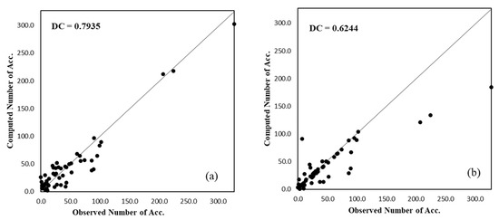 The PSO-ANN model performed well in both the training and testing stages, with a DC value greater than 0.75 for estimating the crash frequency at roundabouts. The hybrid model has demonstrated a higher performance over the ANN model in both the training and testing stages in terms of the model’s goodness of fit (DC) and error metric (RMSE and MAE). However, the ANN model has also demonstrated good and satisfactory results in the training and testing stages, with a DC value of 0.7227 and 0.6244, respectively. The hybrid PSO-ANN model improved the performance of the classical model by 22.3% and 16.9%, respectively, in the training and testing stages. This indicates the reliability and accuracy of the proposed hybrid method. The hybrid PSO-ANN achieves its improved accuracy by systematically optimizing the ANN parameters (bias and weights) using the particle swarm optimization algorithm and through altering the particles position. The successful application and improved performance of PSO-ANN over the classical ANN model can be found in several studies, such as [32]. Other studies affirming the efficiency of machine learning approaches in the prediction of complex parameters include the studies by [33,34].