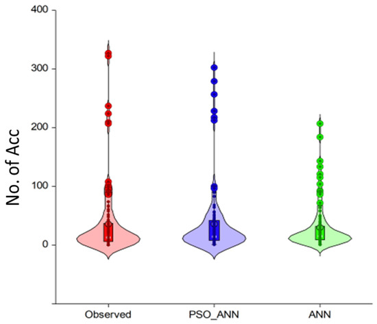 The findings of the investigation were further examined utilizing three graphical charts (scatter plots and violin plots). The scatter plots demonstrate how the observed and anticipated data were compressed along the chart’s diagonal bisector. The denser the data along the diagonal bisector, the more accurate the model, and vice versa. Figure 8 shows that the data in Figure 8a (PSO-ANN) are more along the bisector than in Figure 8b (ANN).