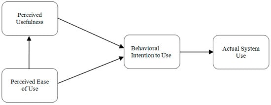 The current research is underpinned by the technology acceptance model (TAM) theory. TAM posits that the widespread adoption of a particular technology in an industry is influenced by two key factors, namely perceived usefulness and perceived ease of use [20,21,22]. In this case, perceived ease of use indicates how confident users feel that adopting a proposed technology will require little mental and physical effort while perceived usefulness indicates whether adopting a specific technology improves performance [23,24]. A summary of the TAM is shown in in Figure 1 [25].