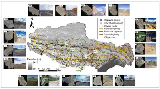 The study area includes Rikaze (Namling, Yadong, Kamba, Dinggye, Nyalam, Gyirong, and Zhongba); Ngari Prefecture (Purang, Zanda, Gar, Rutog, and Ge’gyai); and Nagqu (Nyima, Shenza, and Baingoin). As shown in Figure 1, data collection and analysis included seventeen specific road segments: national, provincial, county, and village roads.