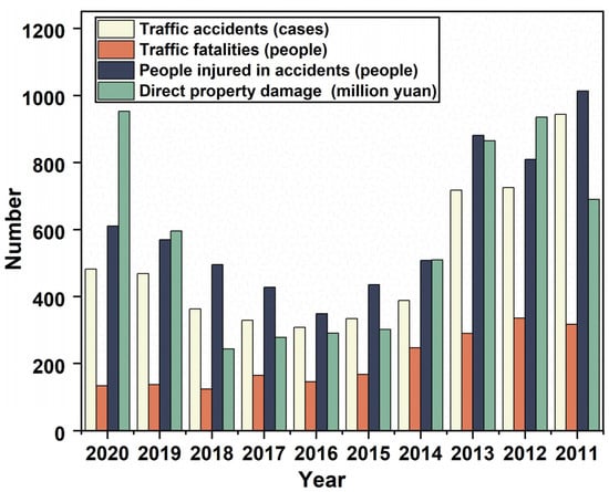 According to statistics, the single-vehicle accident rate in Tibet is 1.58% higher than the regional average, and the average accident fatality rate per period is 2.19 times higher []. Figure 3 shows that the road traffic safety situation continues to be dismal. Analyzing road safety in order to reduce traffic accidents and enhance driving safety is essential.