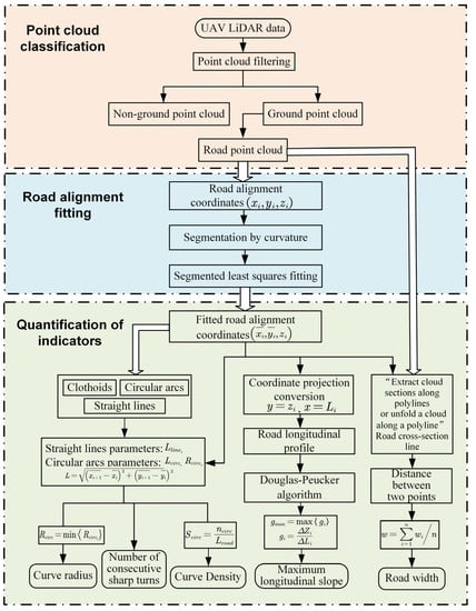 The scanning range of mobile LiDAR is limited and does not provide sufficient information about the road environment. In recent years, UAV laser scanning (ULS) has been utilized extensively as a promising technology. The UAV LiDAR also acquires point cloud data, but has the following advantages []. First, ULS provides a sufficient coverage area for road safety assessment. Second, ULS can give a complete sample of the road boundaries and markings unaffected by obstacle occlusion. Third, collecting data via ULS is cheap and ensures the safety of drivers and surveyors. Researchers have already developed processing methods and analysis frameworks for the UAV-based point cloud. For example, Mohan (2021) [] has developed a fully automated highway inspection framework based on a convolutional neural network using a novel low-power drone. Biçici (2021) [] has proposed a method for road classification and extraction from a UAV point cloud based on random forest and further combines it with the Voronoi diagram to improve the quality of road centerline extraction []. These techniques make ULS data ideal for road safety assessment.