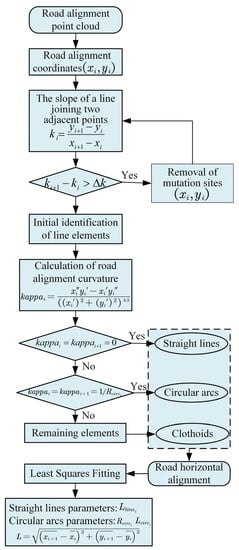 Roads are generally symmetrical to the centerline, which is the basis for road alignment. The density analysis tool in ArcGIS was used to extract the road contour, and the polygon-to-centerline function was used to extract the centerline. The road plane alignment was quickly determined. The road plane alignment comprises circular arcs, straight lines, and clothoids. Likewise, we had to classify the extracted road centerline into various line elements based on its curvature. We applied the least-squares method to eliminate the impact of measurement errors. The algorithm steps are depicted in Figure 5. The alignment point cloud , . The line element fits the sample points as , the fitted curve is noted as , and the fitted alignment point cloud coordinates , .