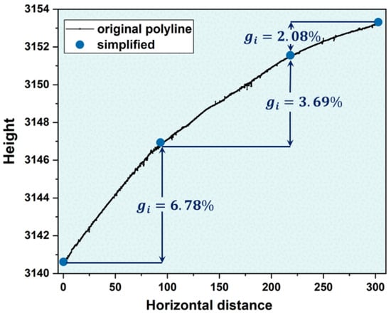 where and represent the height difference and distance between the two endpoints of the same segment. The longitudinal slope requires segmenting the longitudinal section point cloud and dividing it into distinct slope sections. The Douglas–Peucker algorithm was used to segment the midline longitudinal section point cloud. It is a line simplification algorithm that can approximate the curve as a series of folded lines. It uses a small number of points to represent the general shape of the curve.