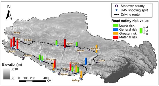 At present, many scholars are studying traffic accidents and their causes on the highway and urban roads, for which safety assessment technology is more advanced []. Compared with urban roads, research on highland road safety has received limited attention. The Tibetan Plateau, one of the world’s most unique geographical regions, faces threats to its transport infrastructure due to its extreme climate, rugged topography, and frequent hazards []. Given the wide variation among road sections, it is crucial to select specific road segments for safety risk assessment in order to prevent traffic accidents and minimize casualties. Traditional road safety assessments, which rely on field measurements being taken by surveyors, are challenging and costly in remote highland areas due to the complex topography and environment. Therefore, we attempted to use unmanned aerial vehicle (UAV) LiDAR scanning technology to improve the accuracy and efficiency of data collection, providing practical technical support for road safety risk assessment.