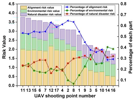 The results indicated that alignment risk accounts for a more significant proportion of greater and material risk roads. It is distinct from environmental and disaster risks. For roads in Tibet, ensuring safe alignment is the primary objective. However, there are portions of the segments in which environmental and natural disaster risks are the primary causes. For instance, the leading cause of Segment 16’s risk is its environment (Figure 13). A steep topographic slope and the potential for falling rocks surround the road. Natural disasters in Segment 5 (Figure 13) are the primary reason for road risk. It is subject to soil sanding, and the moving dunes can bury the road.