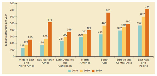 Humanity produces around 2 billion tons of waste every year (World Bank data) [34]. There is a threat that by 2050 this figure will rise to 3.4 billion tons, as each person produces up to 500 kg of waste per year. Figure 2 illustrates the expected generation of waste by individual regions of the world until 2050.