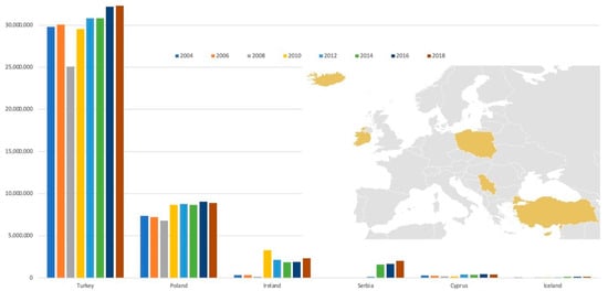 Figure 3, Figure 4 and Figure 5 illustrate the situation in Europe in various EU countries, determining countries with decreasing, stable, and increasing communal waste production between 2004 and 2018.