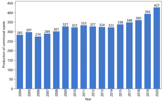 Waste production in Slovakia is growing. Moreover, in the last years, its growth is rapid. In recent years, production of communal waste per inhabitant achieved the level of 427 kg, with a growth of 9%. During the last ten years, the total number increased to 30%. In other words, while in 2008 Slovakia produced waste in the amount of 327 kg per year per inhabitant, in the last year, it was 100 kg more of waste (Figure 6).