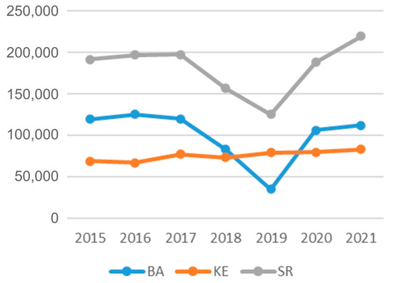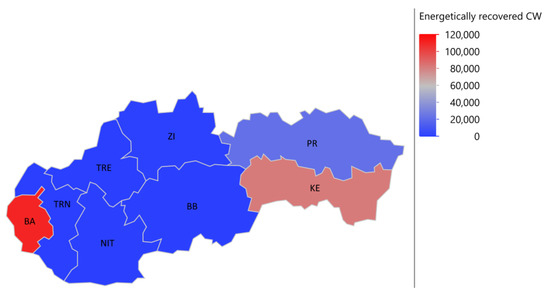 The highest rate of energetically recovered waste is observed in two regions, namely Bratislava (BA) and Košice (KE) (Figure 8). The reason is that it is precisely in these regions that the facilities for the energy recovery of waste are built.