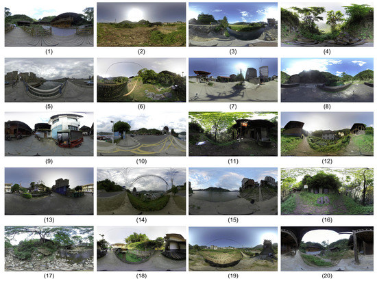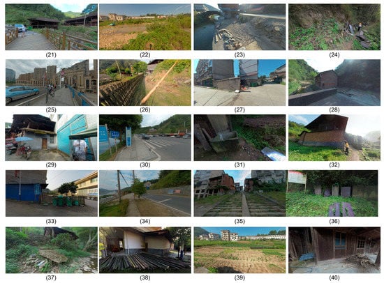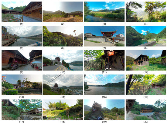 In the next steps, we invited nine university professors majoring in landscape design and visual design as experts to evaluate these 61 photos, from which we selected 20 panorama photos of urban and rural scenes with the most distinctive characteristics of both kinds of differences as the samples for the empirical study. To ensure that the selected photos present as many positive and negative perspective differences as possible, this study sought to take this into full consideration in the selection of experts. At the same time, this study referred to a pre-drafted list of landscape perception evaluation indicators to ensure that the screened landscape samples could reflect the landscape patterns of each survey area as much as possible, and these samples were categorized and labeled. With the premise of minimizing the testers’ testing time, we made efforts to present the original appearance of the landscape space in the region comprehensively.